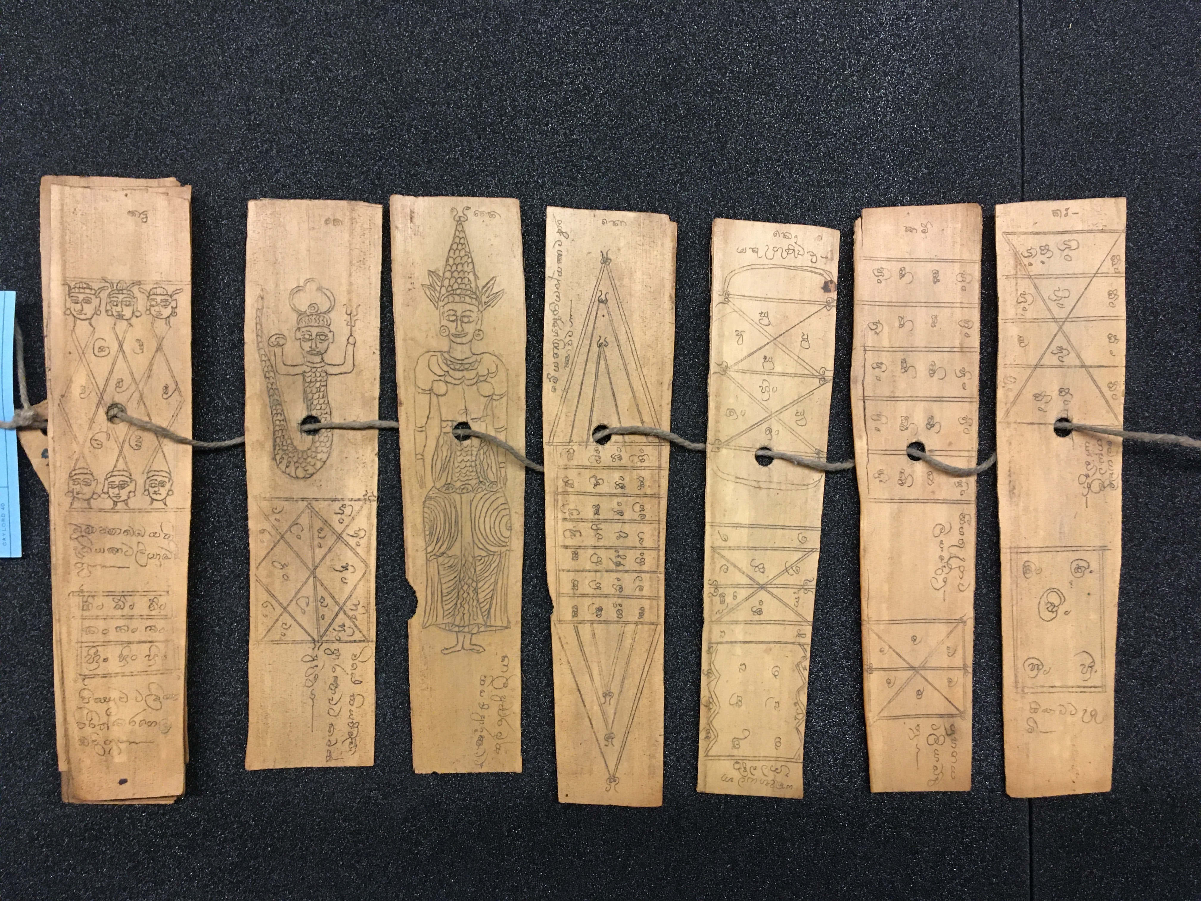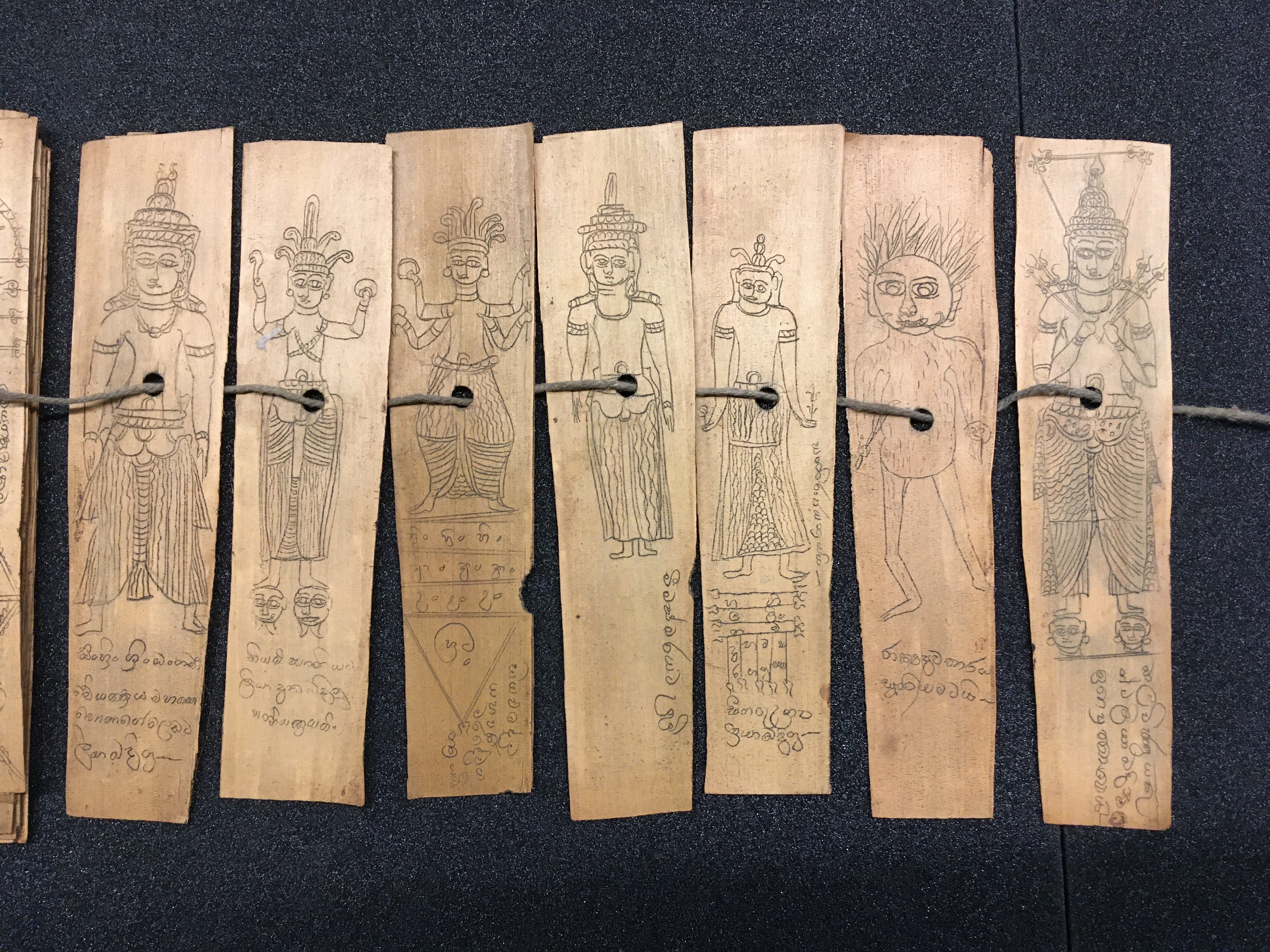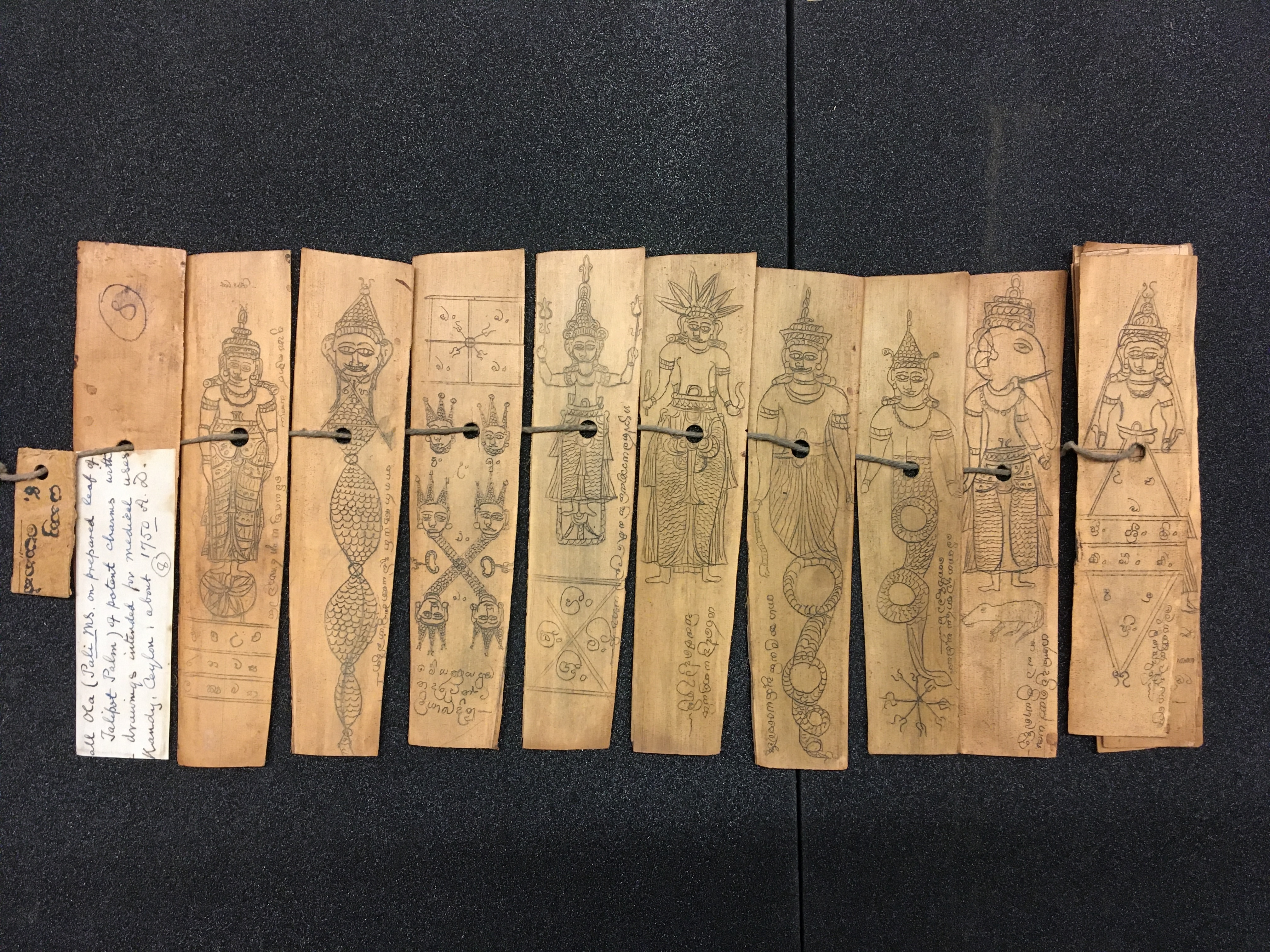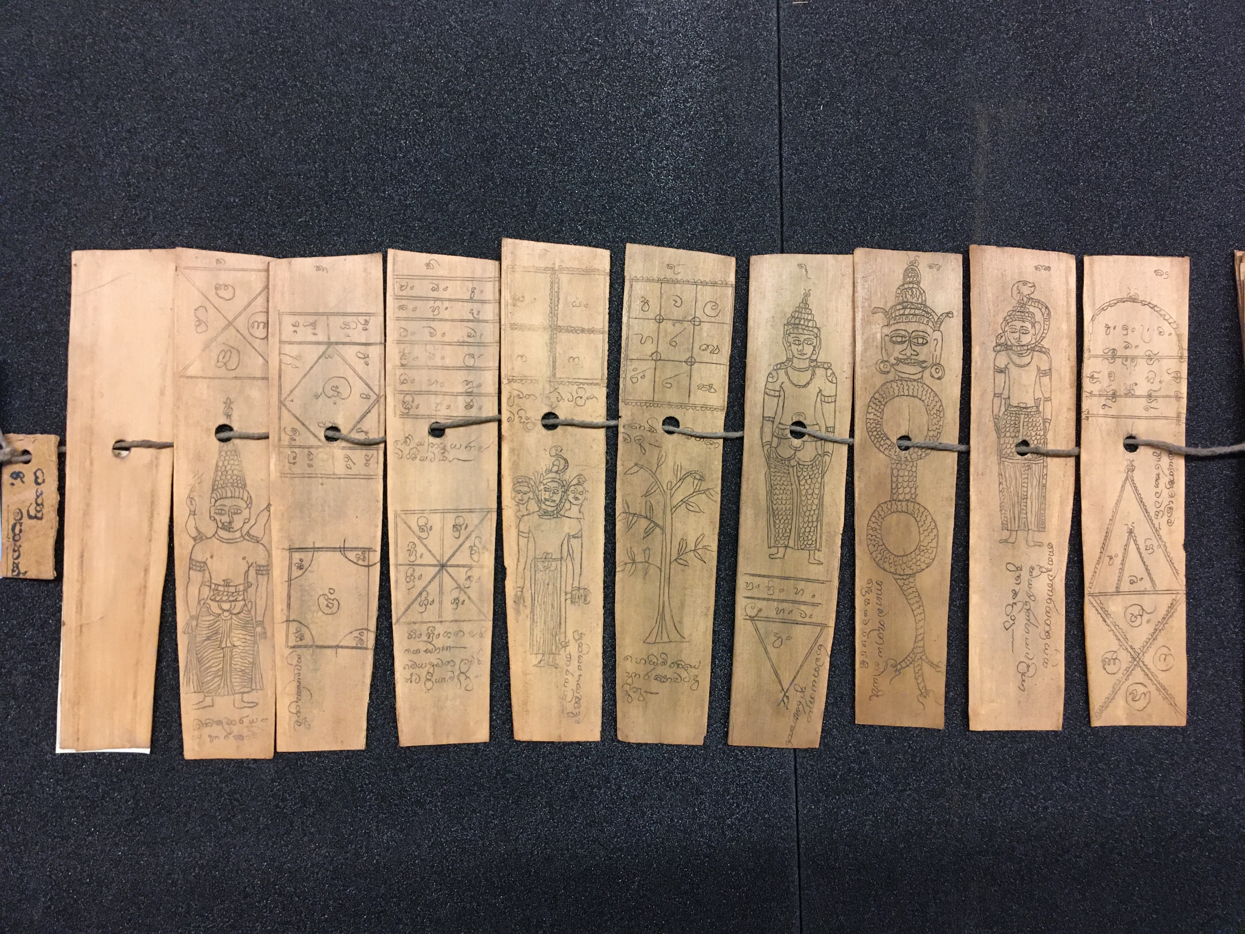 The olas consist of either Talipot or Palmyra palm leaves, which in some cases are held between two lacquered board covers by a cord (wound around the ola) attached at one end to a button or medallion, and at the other to a ball, tassle, or simple knot. The covers are not original but are modern following the original design. Other olas are just tied together with a cord, or the leaves are joined accordion style. After the palm leaves were prepared for inscription, the letters were incised using a sharp stylus, an example of which is included in the collection, and then ink was wiped into the incisions.