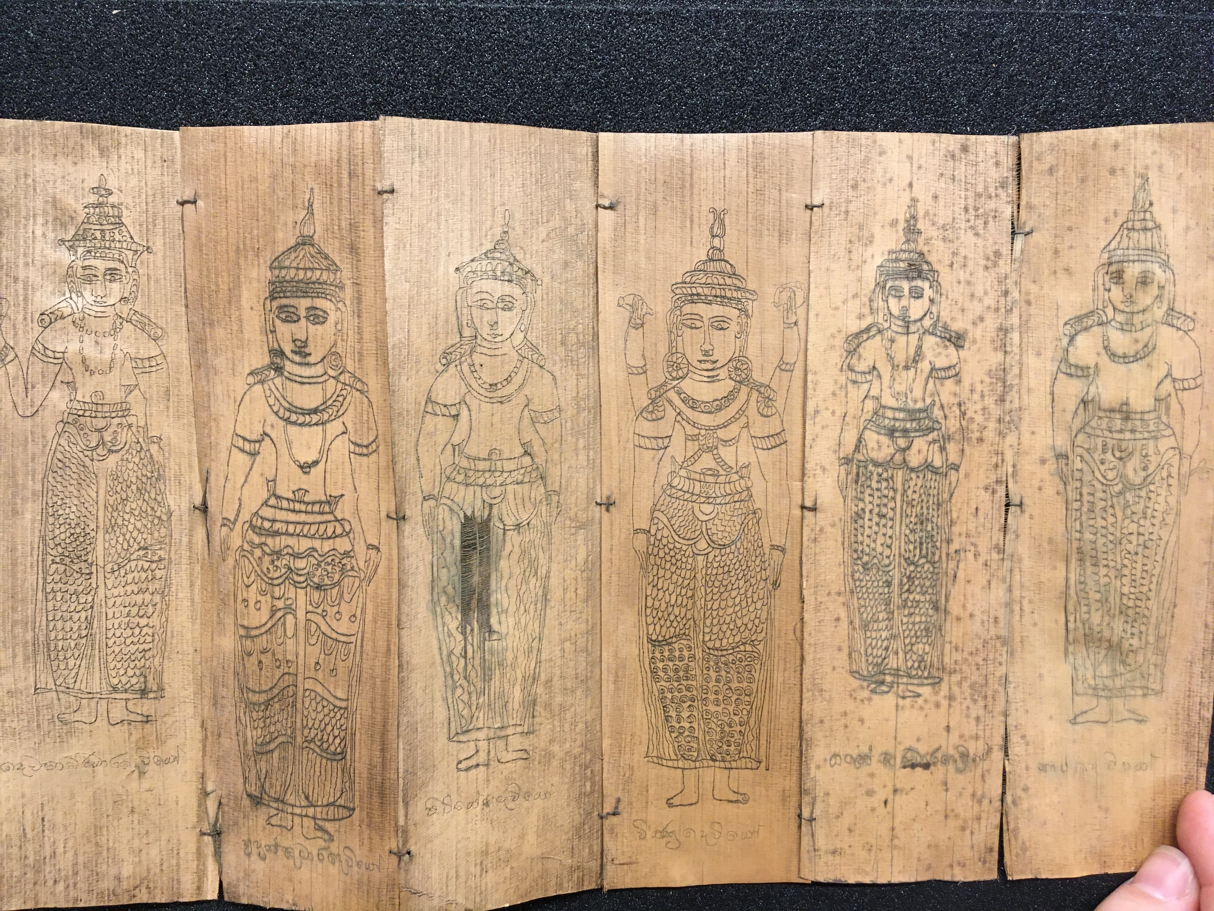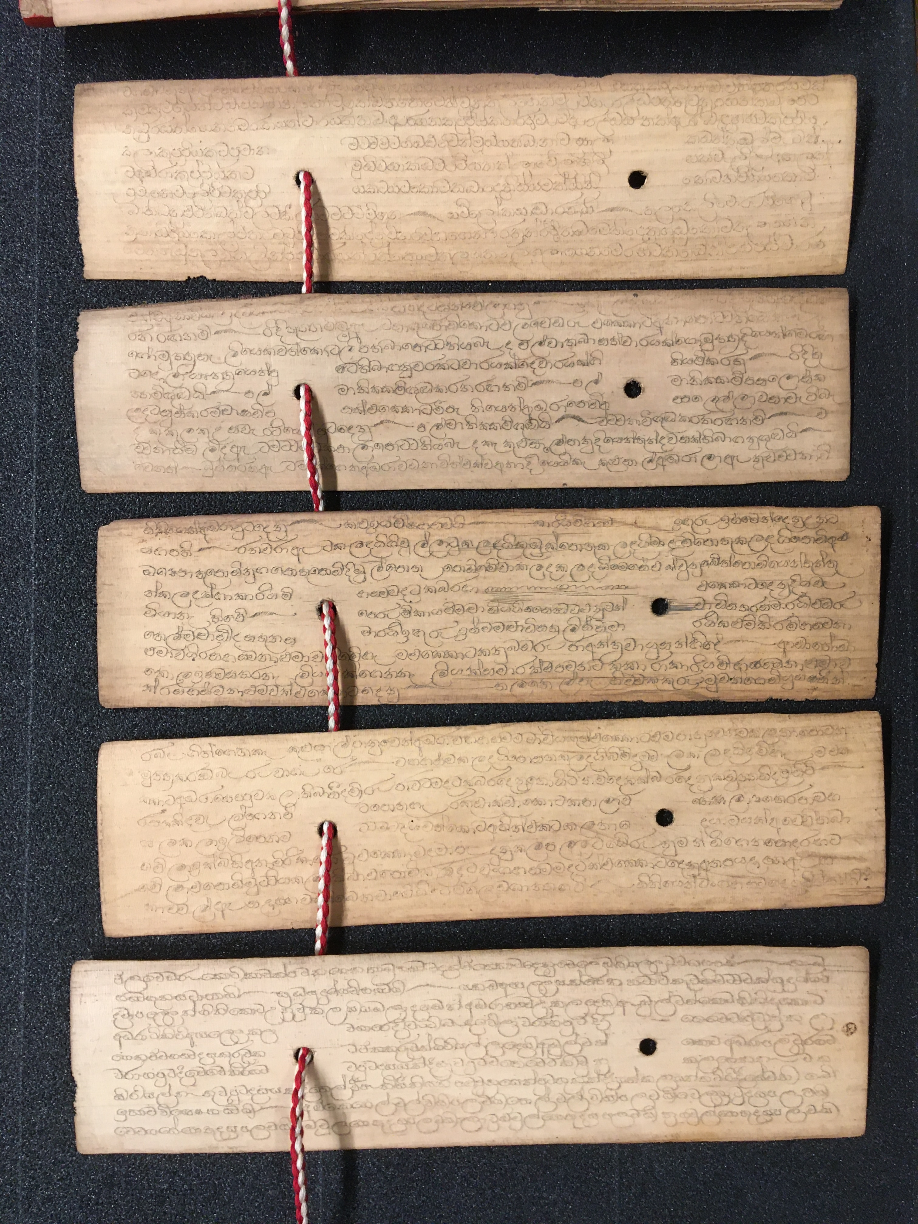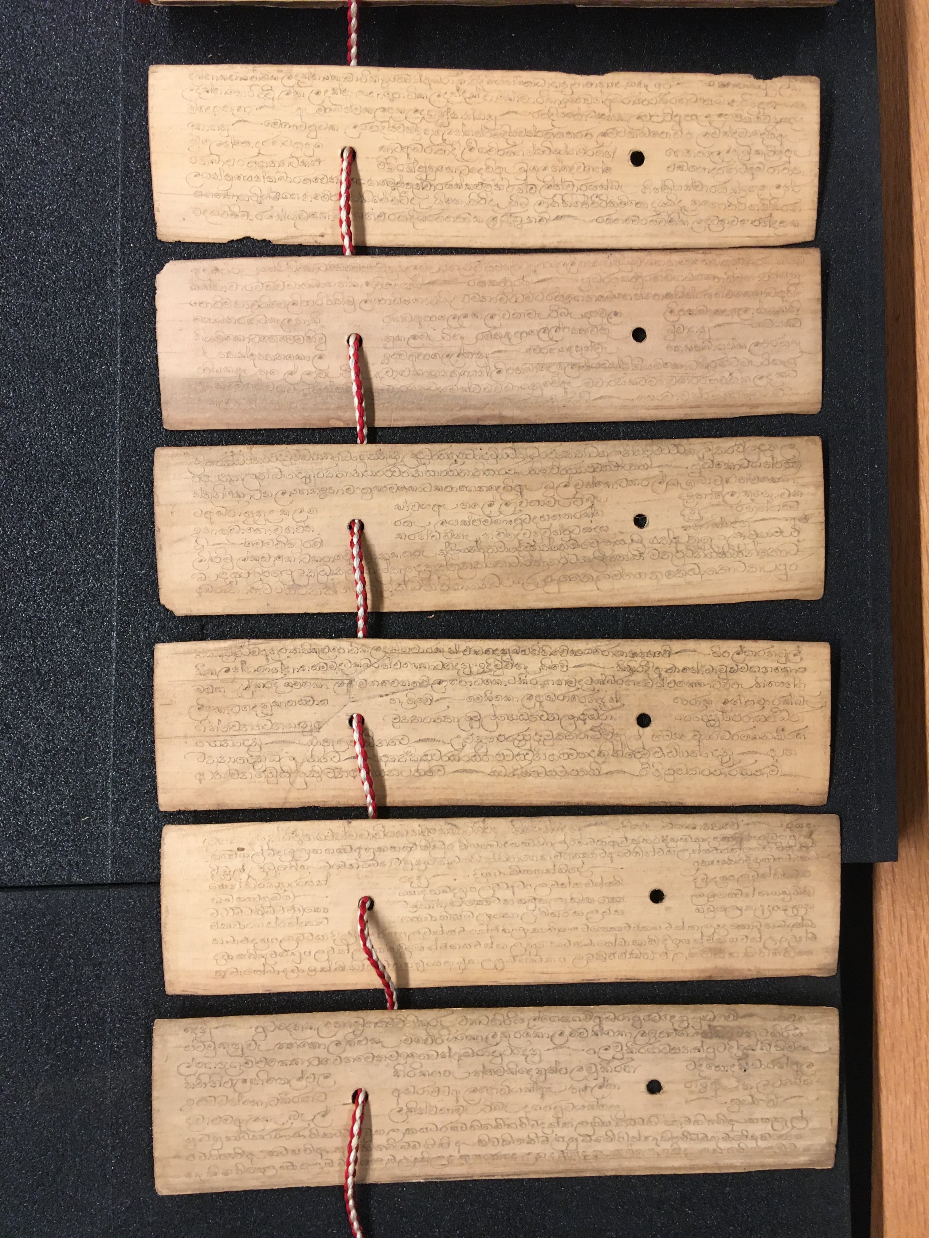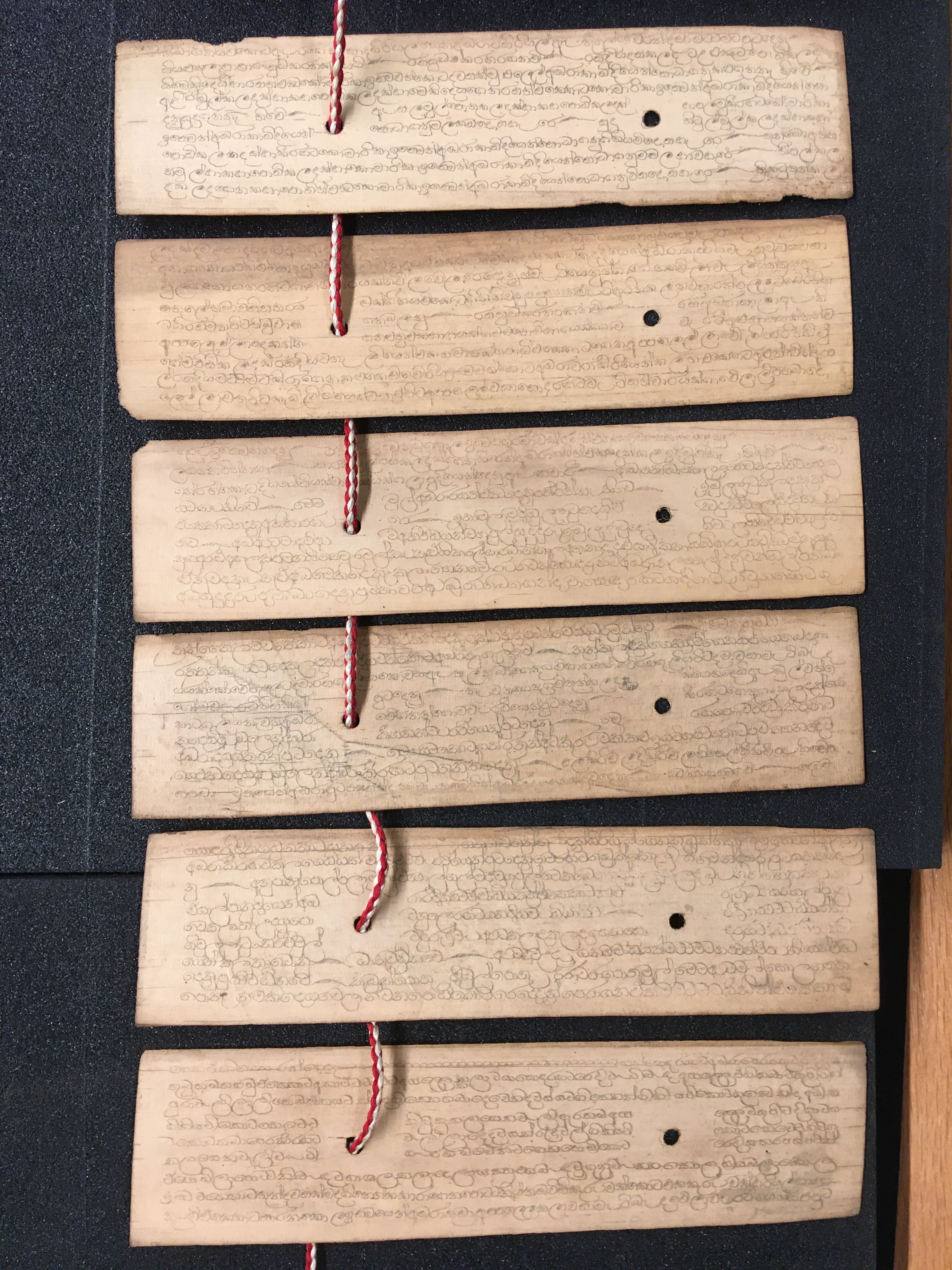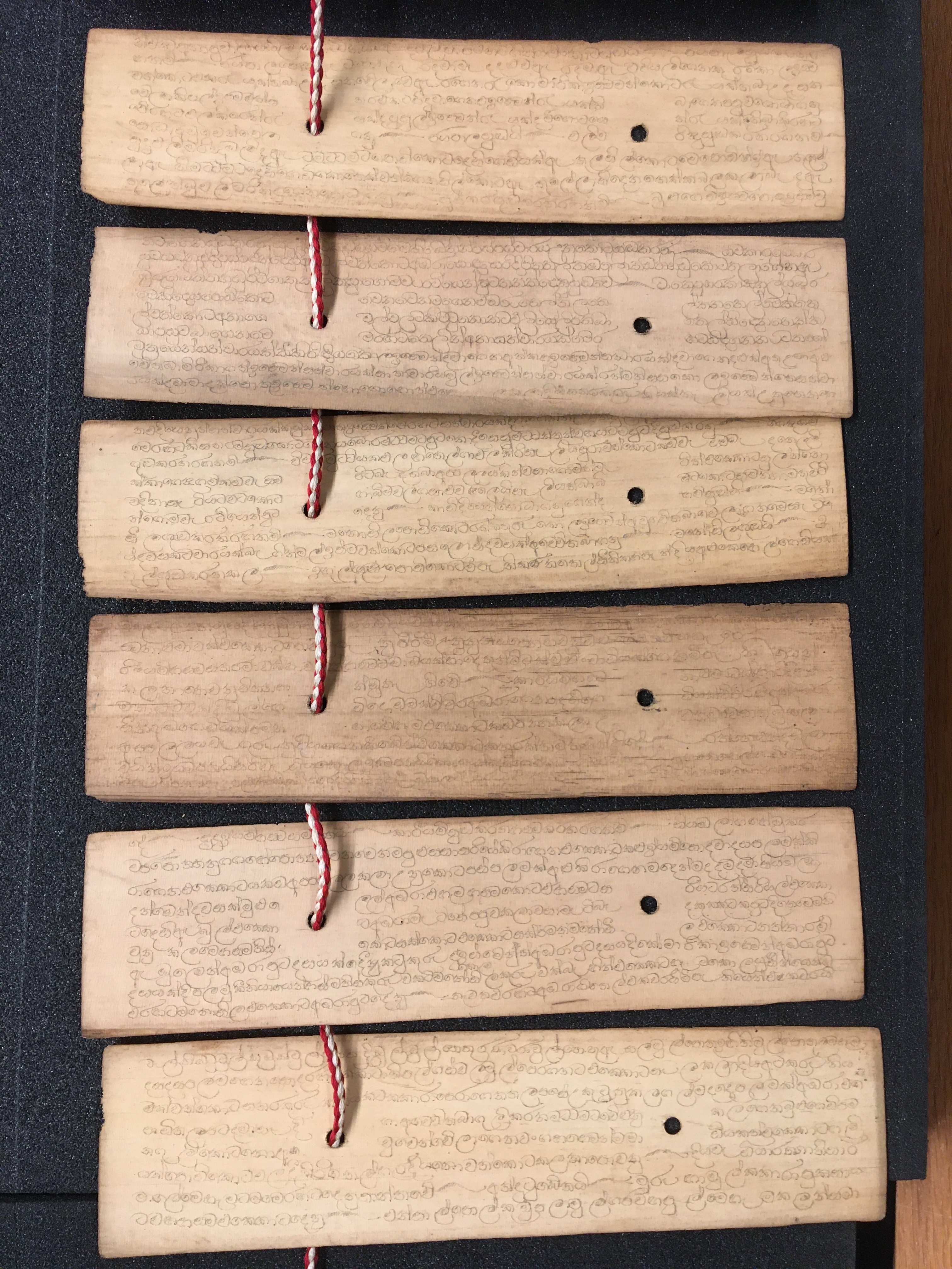 The olas consist of either Talipot or Palmyra palm leaves, which in some cases are held between two lacquered board covers by a cord (wound around the ola) attached at one end to a button or medallion, and at the other to a ball, tassle, or simple knot. The covers are not original but are modern following the original design. Other olas are just tied together with a cord, or the leaves are joined accordion style. After the palm leaves were prepared for inscription, the letters were incised using a sharp stylus, an example of which is included in the collection, and then ink was wiped into the incisions.