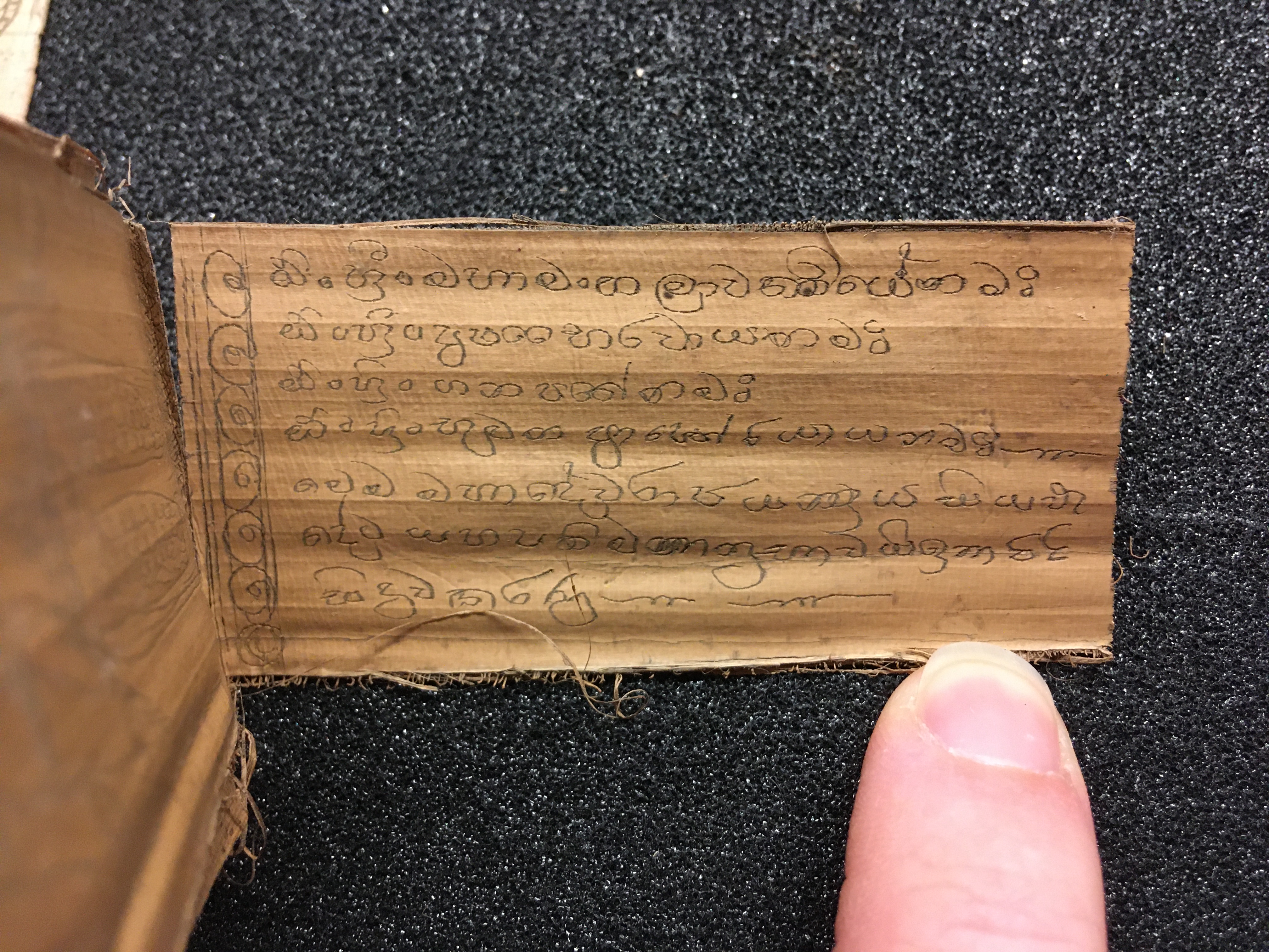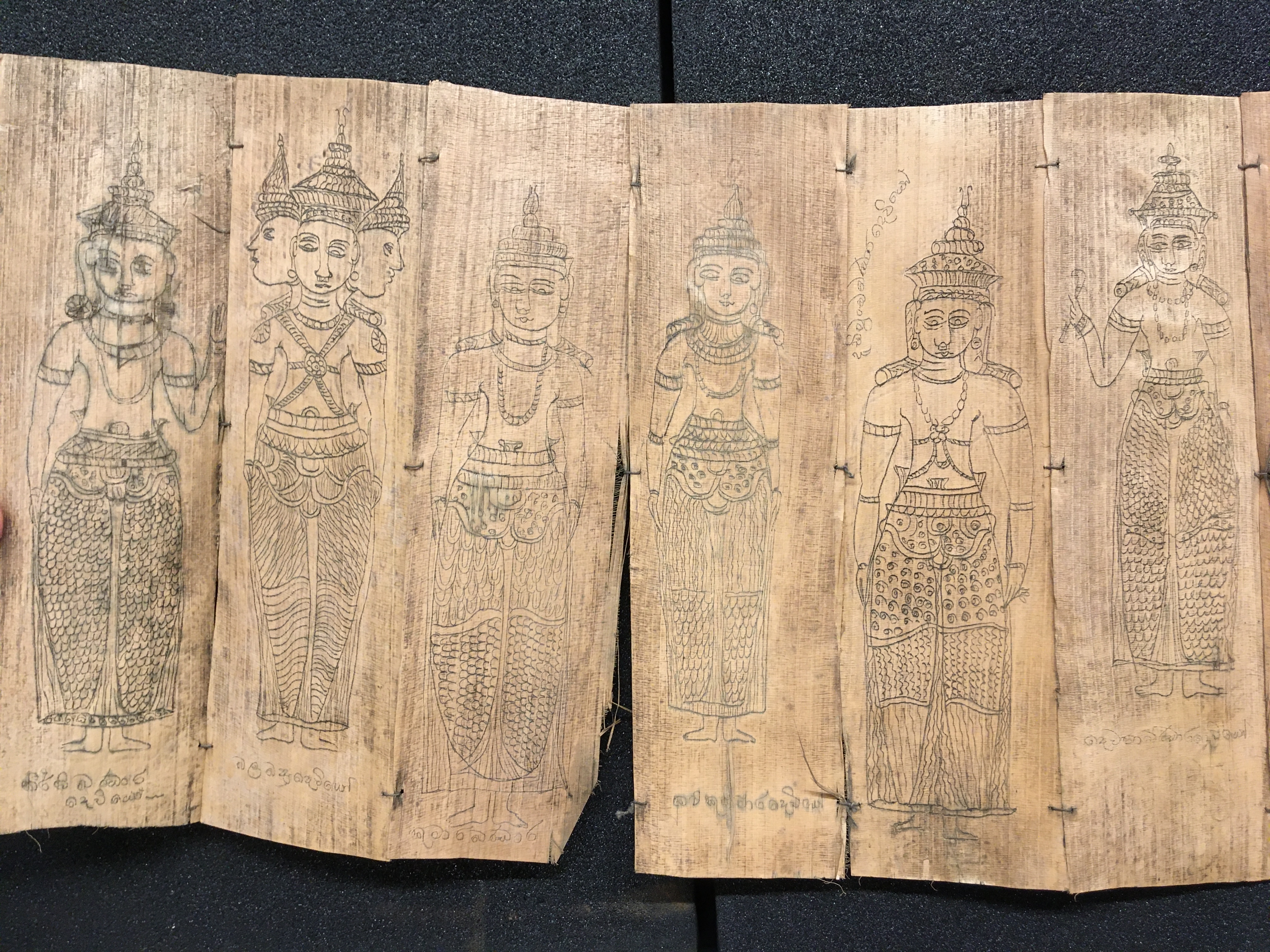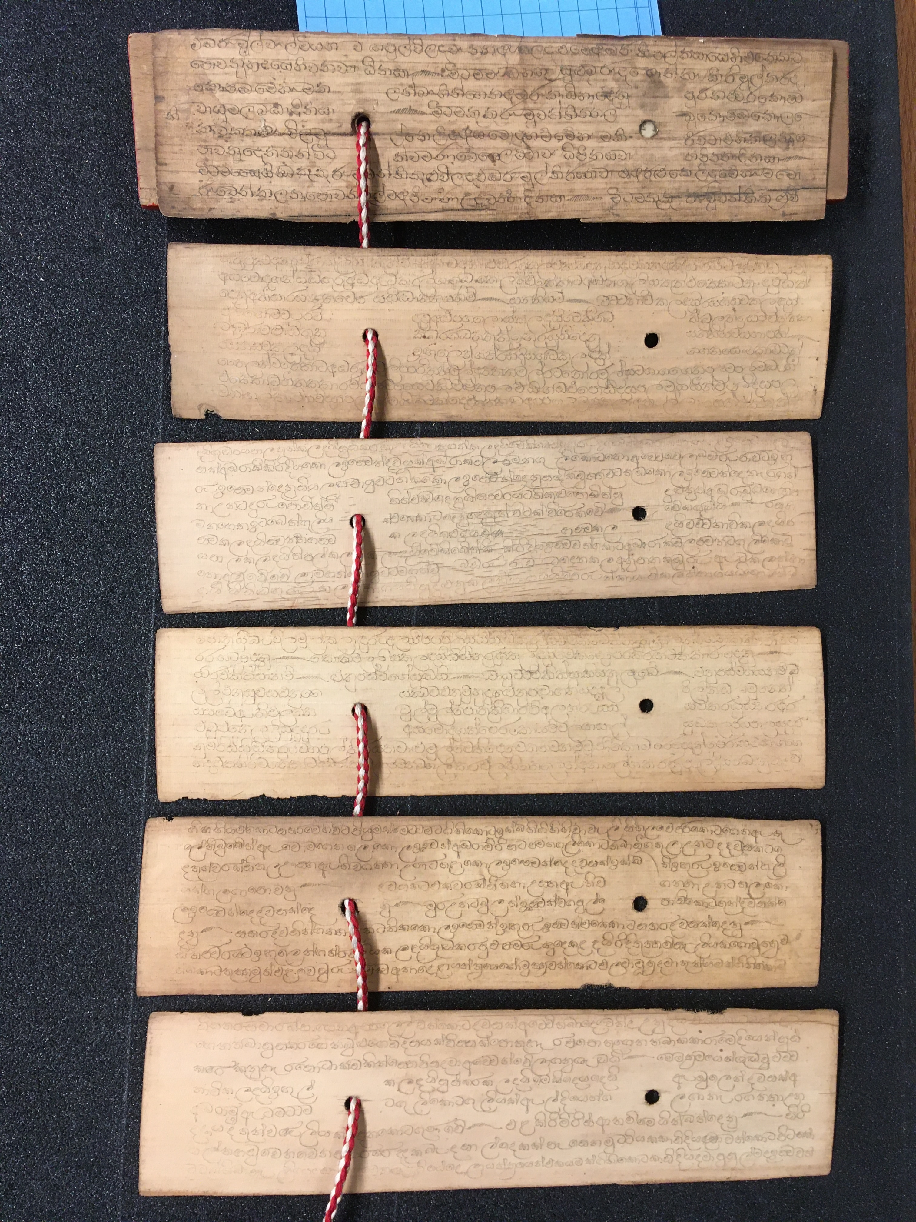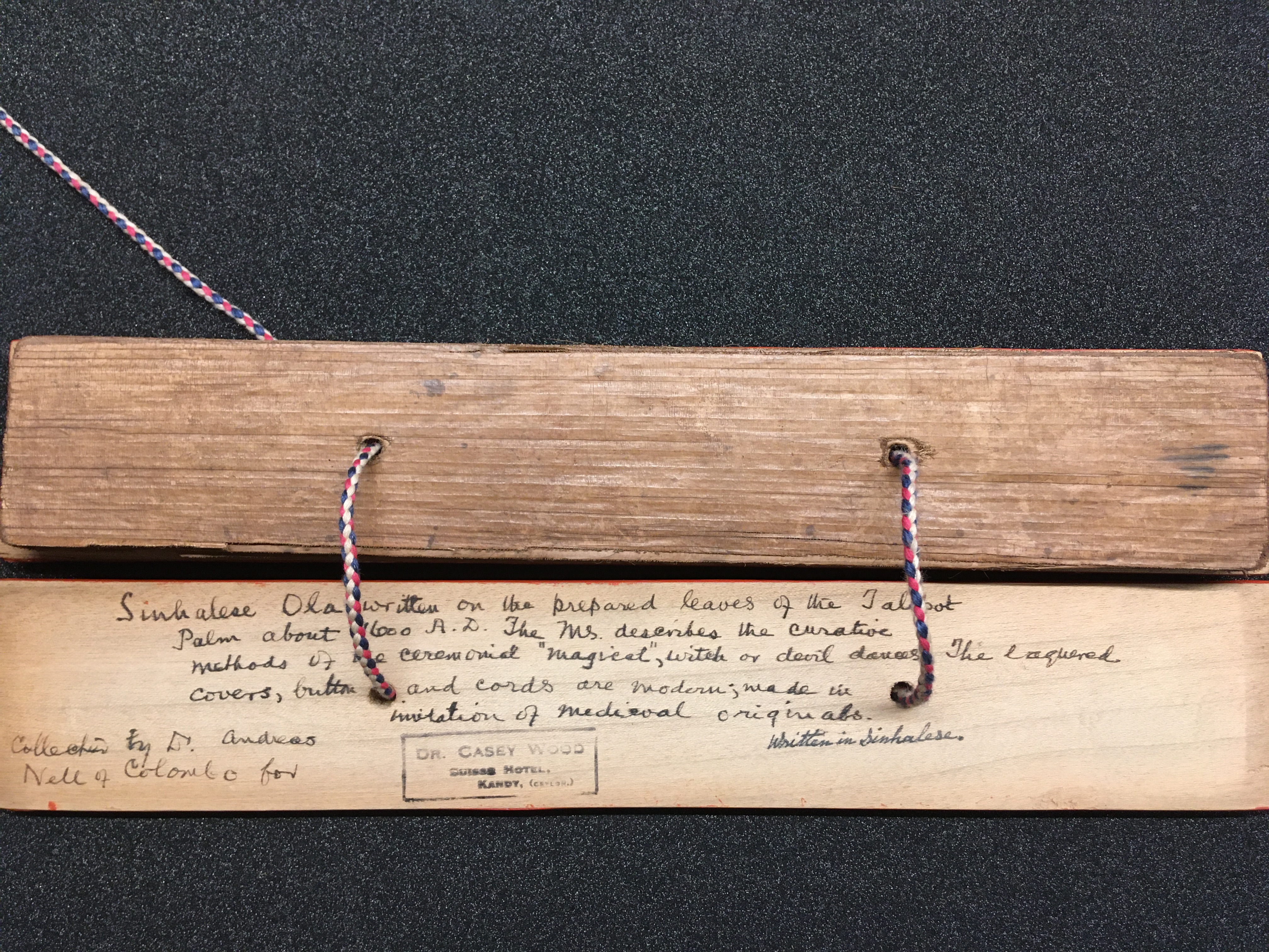 The olas consist of either Talipot or Palmyra palm leaves, which in some cases are held between two lacquered board covers by a cord (wound around the ola) attached at one end to a button or medallion, and at the other to a ball, tassle, or simple knot. The covers are not original but are modern following the original design. Other olas are just tied together with a cord, or the leaves are joined accordion style. After the palm leaves were prepared for inscription, the letters were incised using a sharp stylus, an example of which is included in the collection, and then ink was wiped into the incisions.