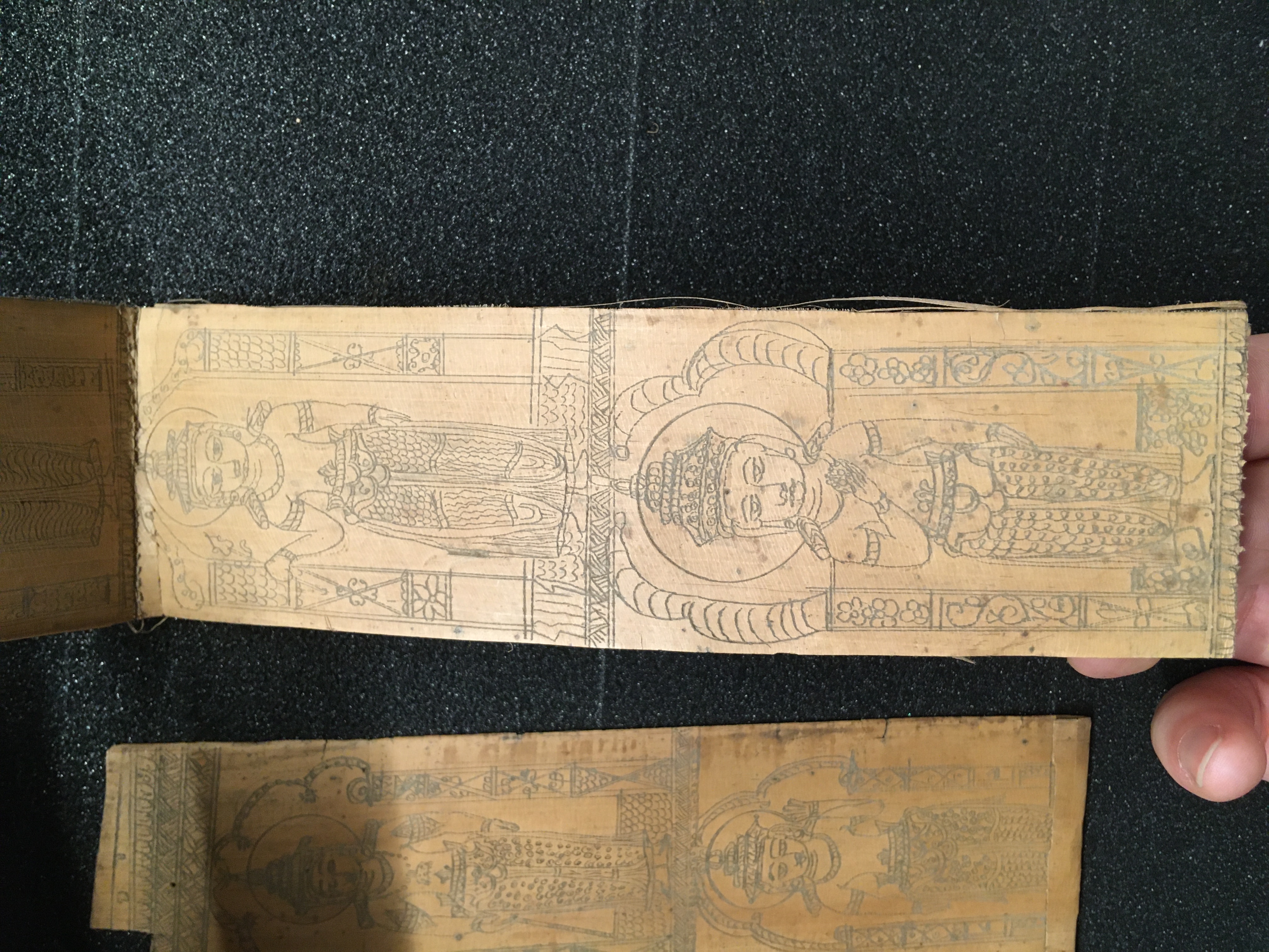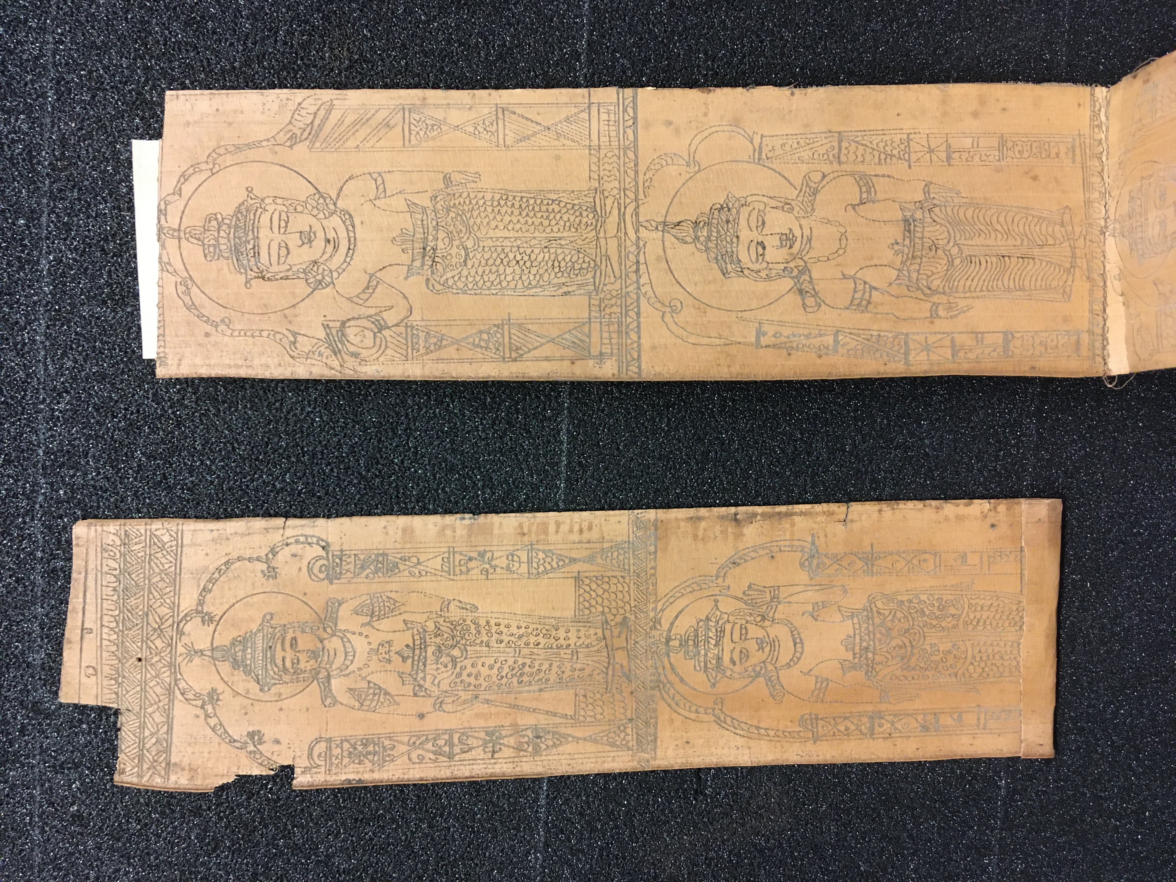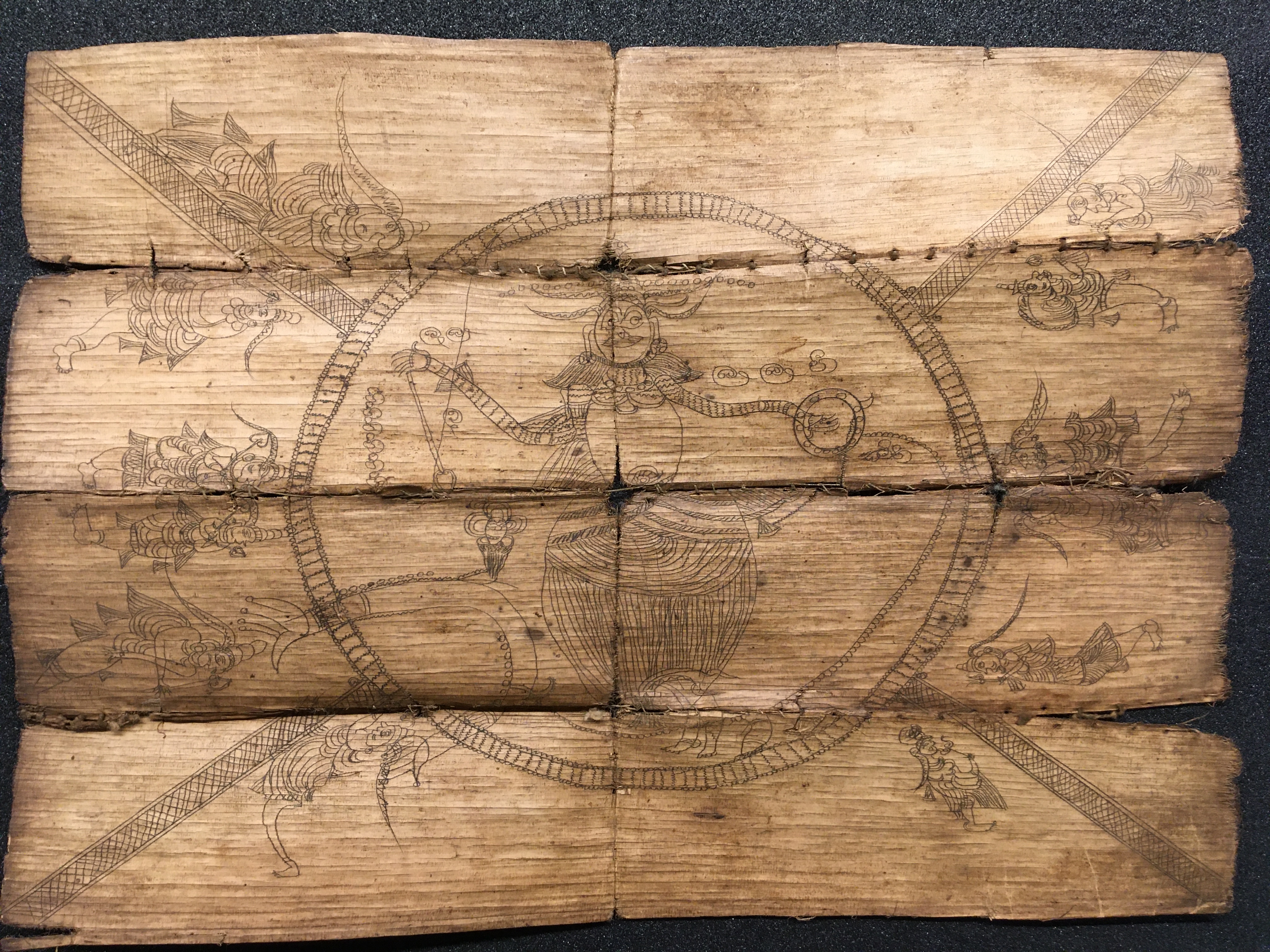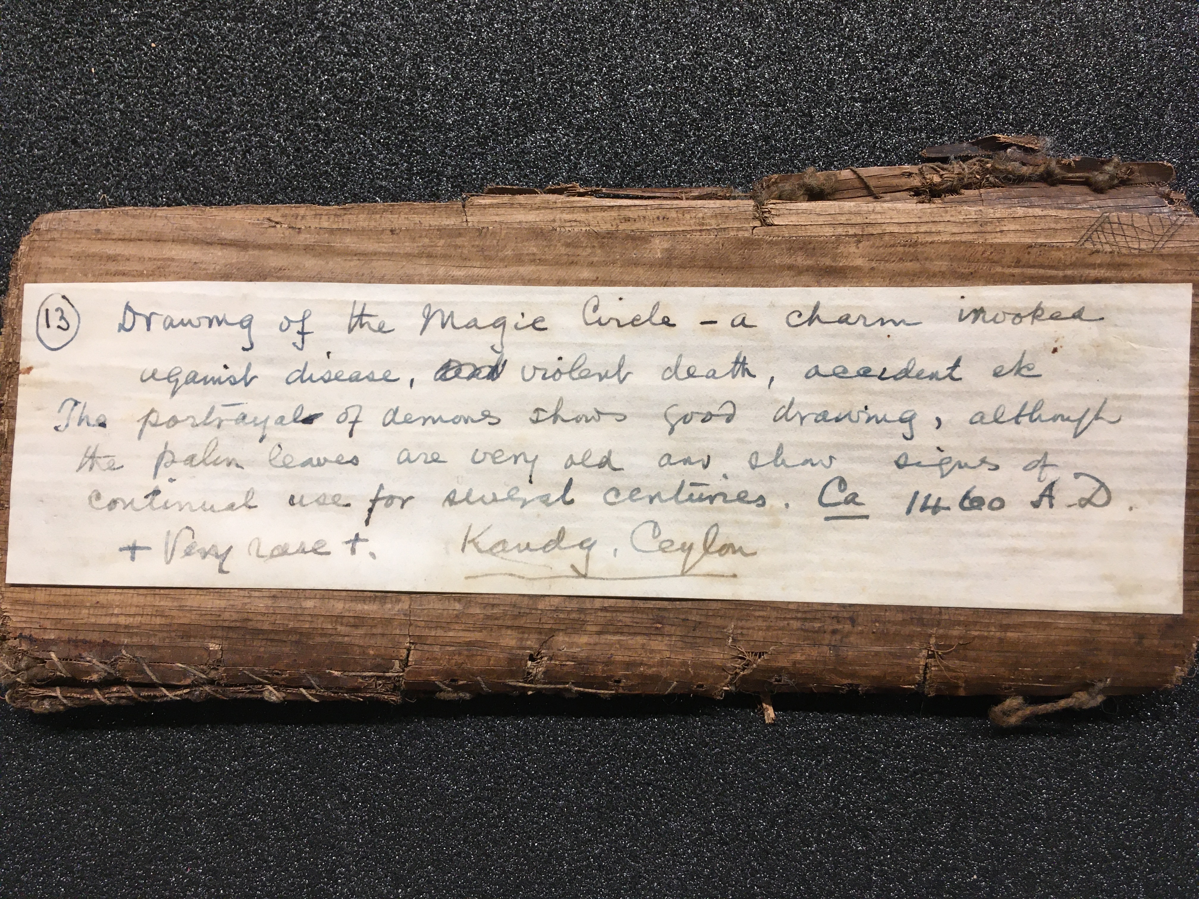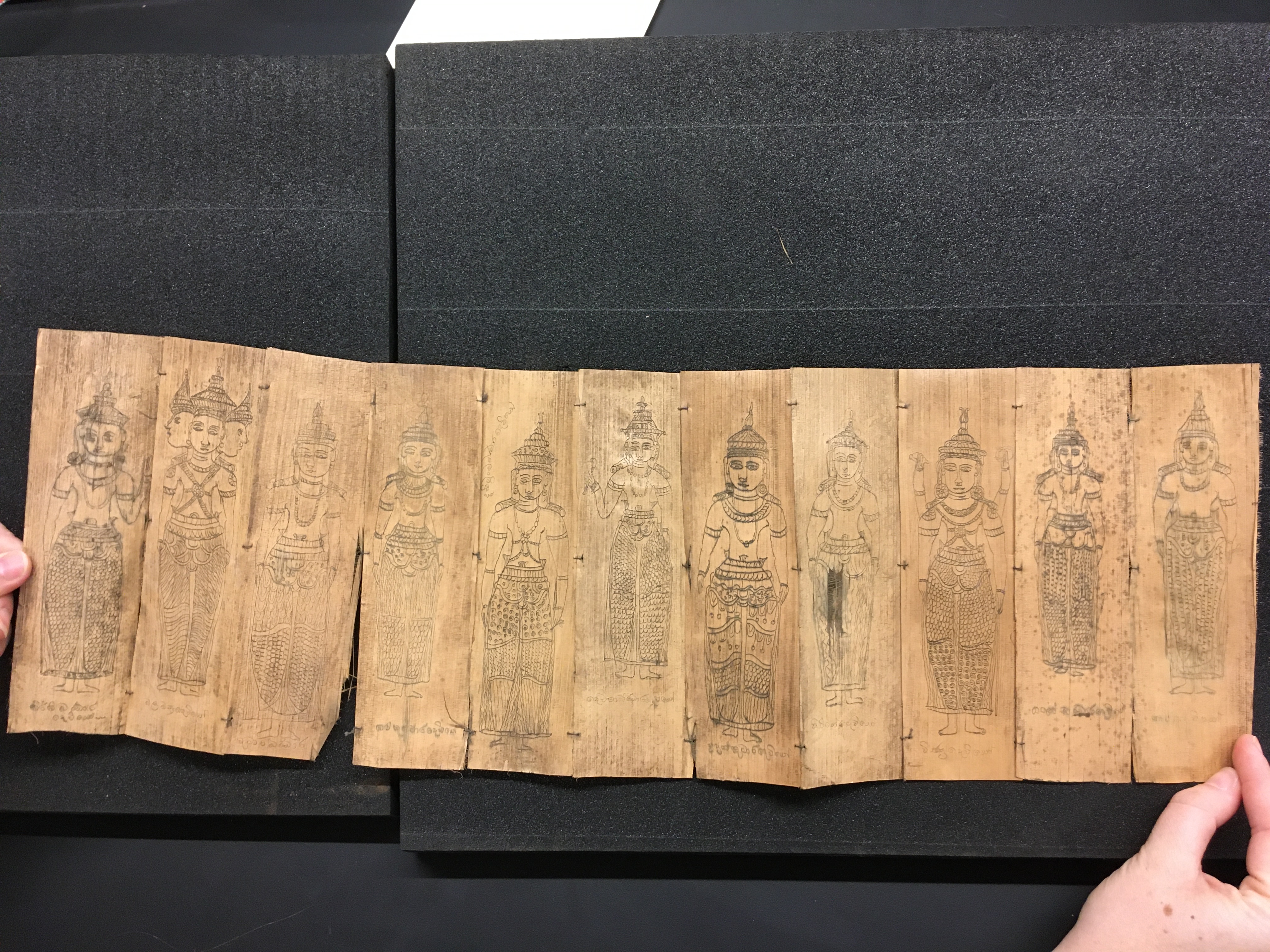 The olas consist of either Talipot or Palmyra palm leaves, which in some cases are held between two lacquered board covers by a cord (wound around the ola) attached at one end to a button or medallion, and at the other to a ball, tassle, or simple knot. The covers are not original but are modern following the original design. Other olas are just tied together with a cord, or the leaves are joined accordion style. After the palm leaves were prepared for inscription, the letters were incised using a sharp stylus, an example of which is included in the collection, and then ink was wiped into the incisions.
