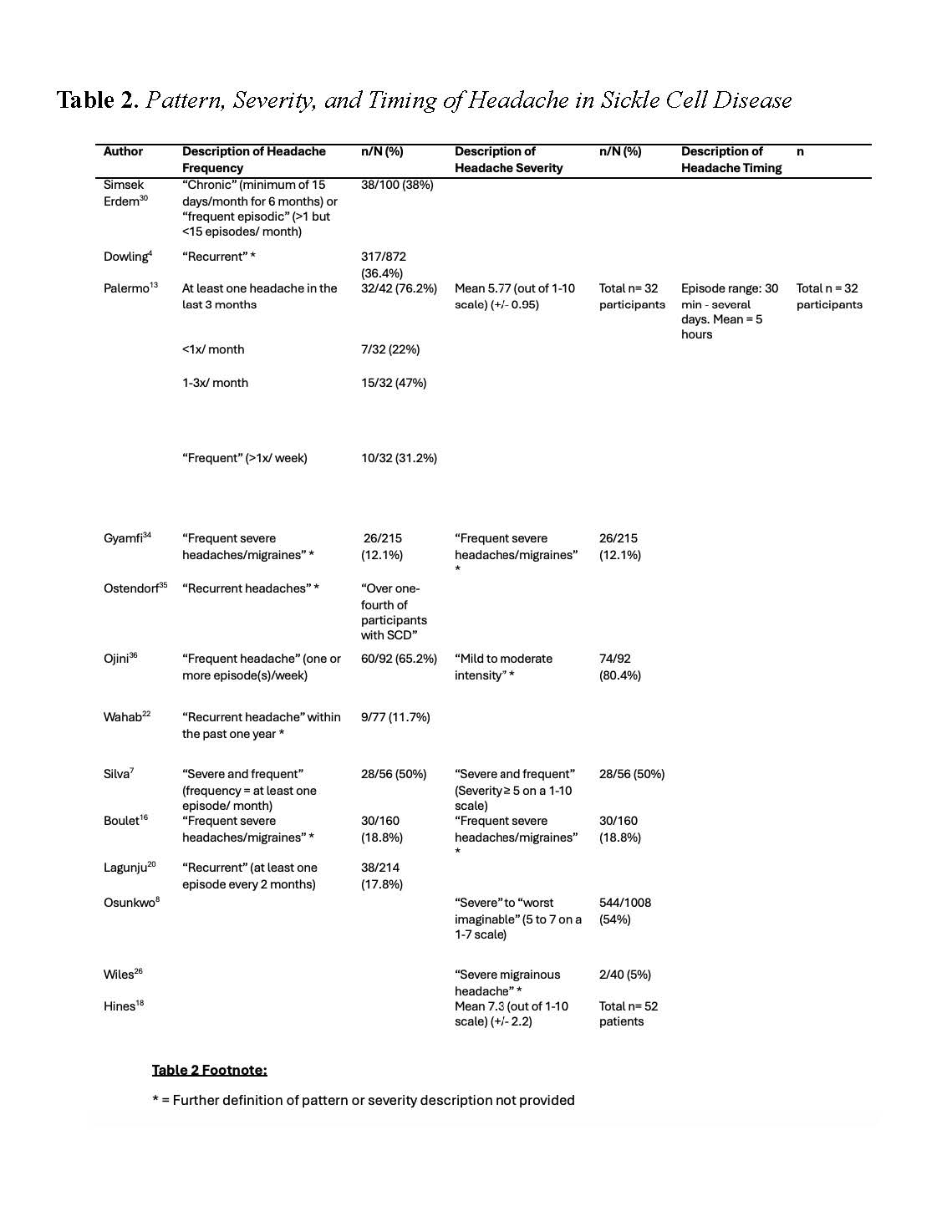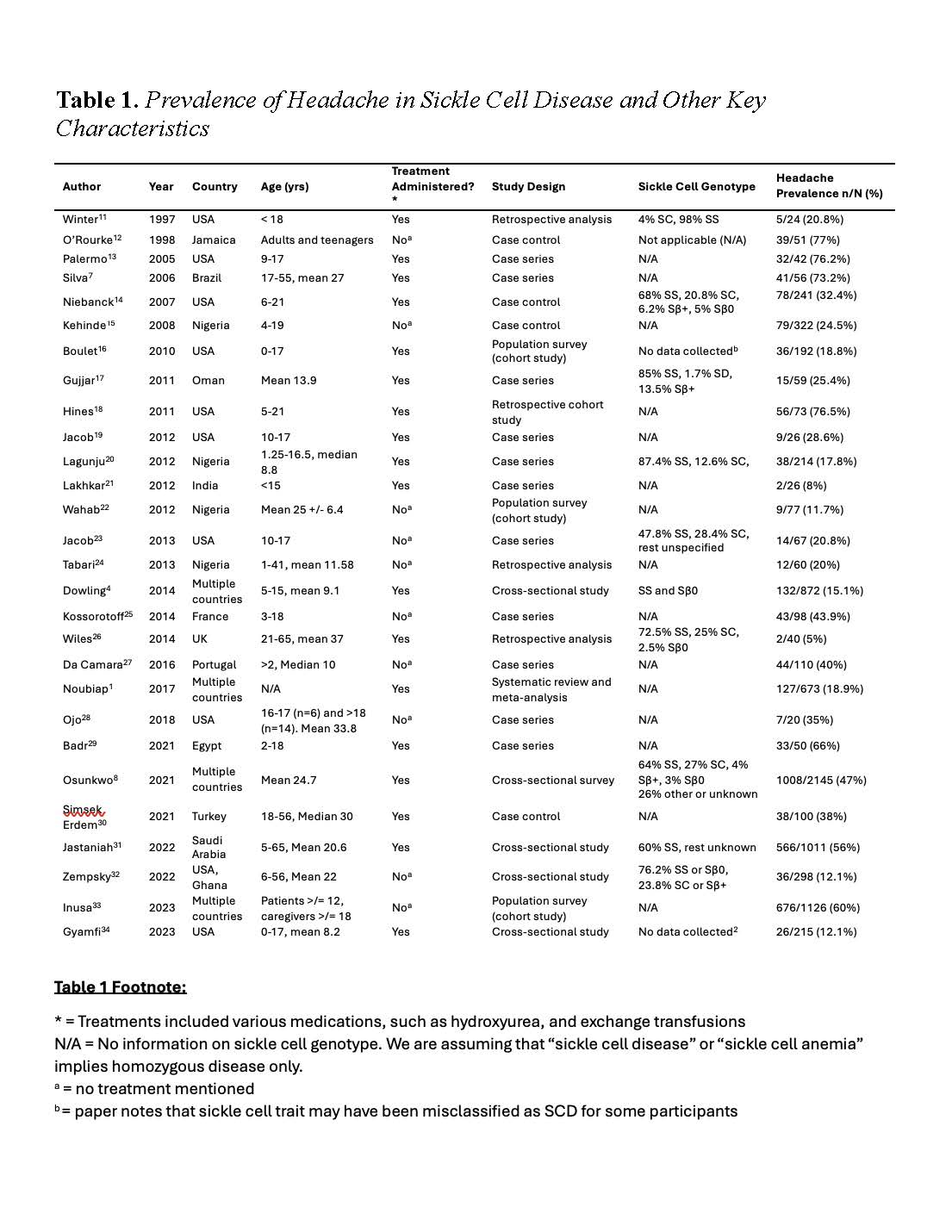 Results: 30 articles were included for final review. They generally employed small sample sizes, disparate methods, and retrospective analyses. The overall prevalence of headaches was 34% though a few larger studies showed prevalence of headaches in SCD ranging from 47% to 60%. Headache severity varied and could have features of migraine headaches, however, information on headache characteristics was limited.