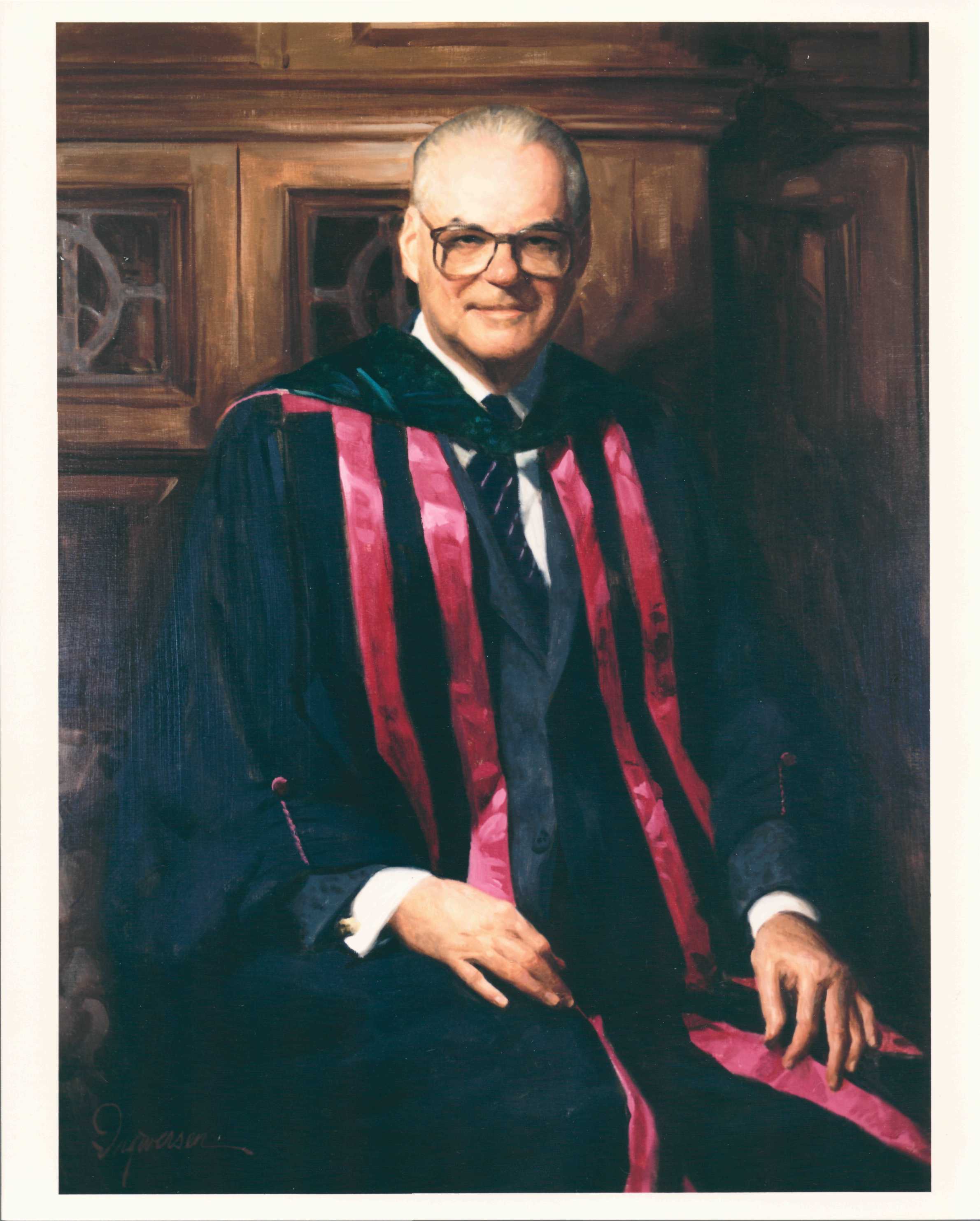 Oil on canvas portrait of Dr. James E. Eckenhoff by artist James Ingwersen. Measures 132 cm H x 105 cm W x 5 cm D. Plaque, measuring 10.2 cm H x 15.2 cm W x 2.5 cm reads: James E. Eckenhoff, M.D., ScD. Dean 1970-1983 Northwestern University Medical School. Photo of framed portrait housed in Galter Health Sciences Library, Feinberg School of Medicine, Northwestern University, Chicago, IL. Portrait unveiled June 2, 1983 in the auditorium of the Alumni Center for Continuing Education, Ward Building. President Robert Strotz accepted the portrait on behalf of the University. Prior to the unveiling ceremony, a reception was held in tent erected on the Ward Building grounds, attended by donors to the portrait fund and honored guests. (Source: Northwestern University Medical Center Magazine 6(3):6, Autumn 1983.)